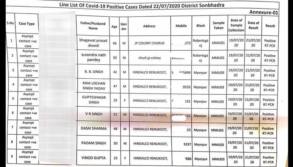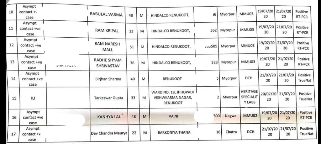 सोनभद्र : सोनभद्र में आज फिर 17 कोरोना के पॉजिटिव केस मिलने से हड़कंप मच गया। सबसे ज्यादा केस हिण्डाल्को रेनुकूट से सामने आये हैं। यहा आज दिनांक 22 जुलाई को 11 केस कोरोना पॉजिटिव मिले हैं। वही रेनुकूट में कुल पॉजिटिव केस की संख्या 13 सामने आई है। लगातार बढ़ रहे केस से रेनुकूट वासियों के मन मे दहशत का माहौल है। वहीं हिण्डाल्को कंपनी पहले से अधिक सतर्क हो गई है। कैंपस को सील कर दिया गया हैं वही हॉस्पिटल में ओपीडी बंद कर के केवल ऑनलाइन अपॉइंटमेंट के जरिये टेलीफोनिक उपचार जारी रखा गया है। रामपुर बरकोनिया, चुर्क, वैनी में भी मिले कोरोना संक्रमित मरीजो के मिलने से स्वास्थ्य विभाग परेशान है।
