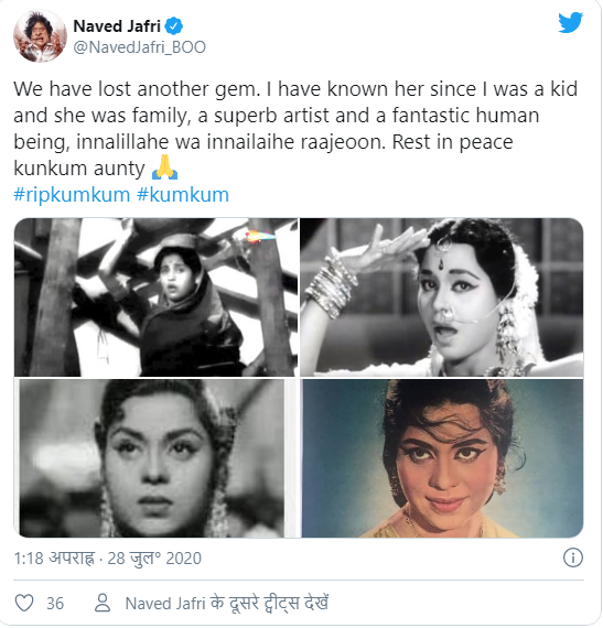 इस क्रम में एक्टर जगदीप के बेटे नावेद जाफरी ने ट्वीट कर अभिनेत्री के निधन पर शोक जताया है। उन्होंने लिखा- हमनें एक और मोती खो दिया। मैं बचपन से इन्हें जानता था। वह हमारे लिए परिवार थीं। एक अच्छी इंसान। भगवान आपकी आत्मा को शांति दें, कुमकुम आंटी।