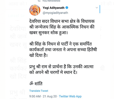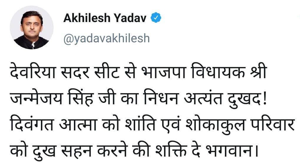 इस क्रम में जन्मेजय सिंह के निधन पर सीएम योगी आदित्यनाथ ने दुख जताया है. उन्होंने ट्वीट कर कहा, “देवरिया सदर विधान सभा क्षेत्र के विधायक श्री जन्मेजय सिंह के आकस्मिक निधन की खबर सुनकर शोक हुआ. श्री सिंह के निधन से पार्टी ने एक समर्पित कार्यकर्ता तथा जनता ने अपना सच्चा हितैषी खो दिया है. प्रभु श्री राम से प्रार्थना है कि उनकी आत्मा को अपने श्री चरणों मे स्थान दें.”